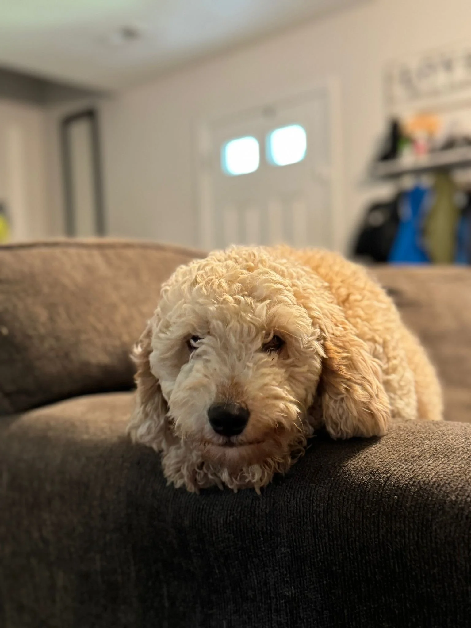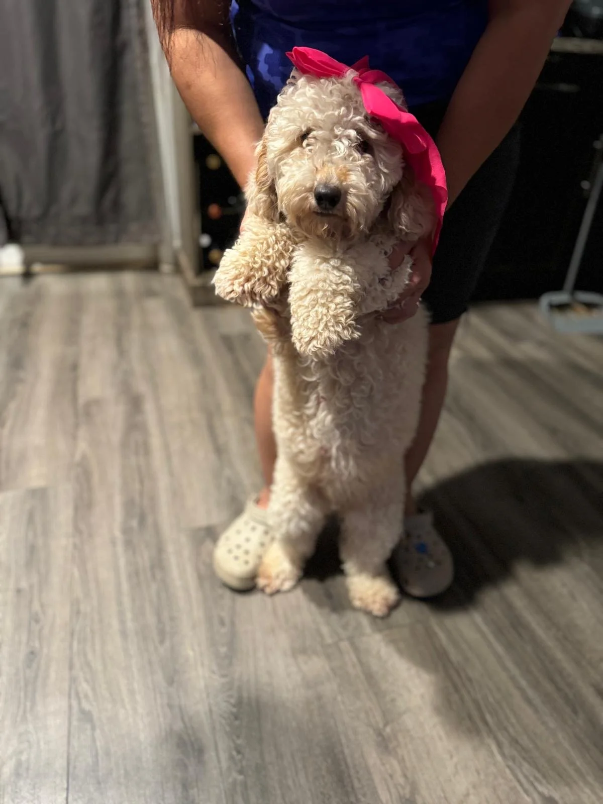 Introducing Leah, our charming F1b light apricot/cream mini goldendoodle girl. Leah’s beautiful, fluffy coat and friendly personality make her standout. She’s a curious and lively little dog who enjoys playing with toys and exploring new environments. Leah is also incredibly sweet, always eager to give and receive affection. Whether she’s running around or nestled in a cozy spot, Leah is a delightful companion who brightens up every moment.