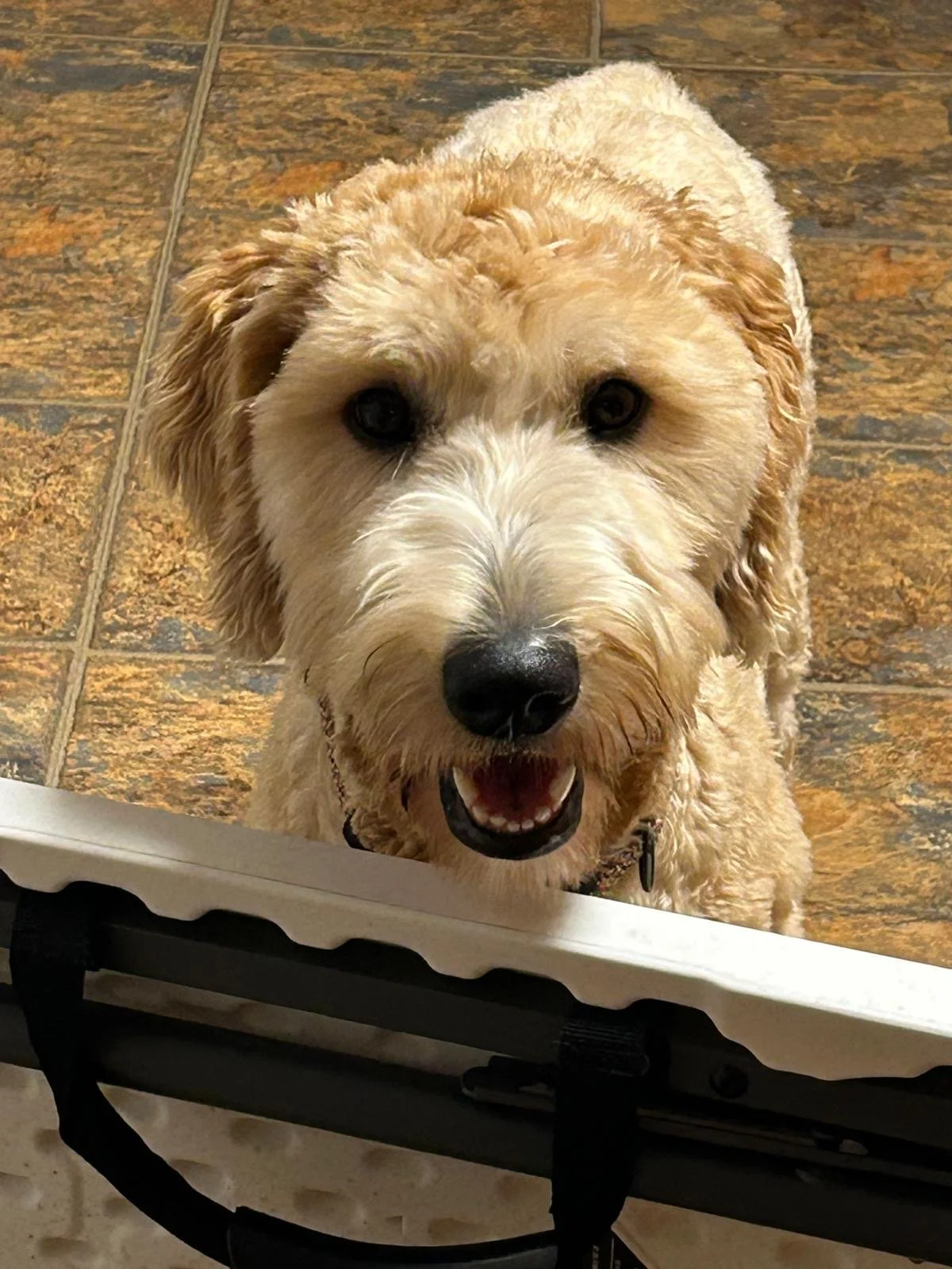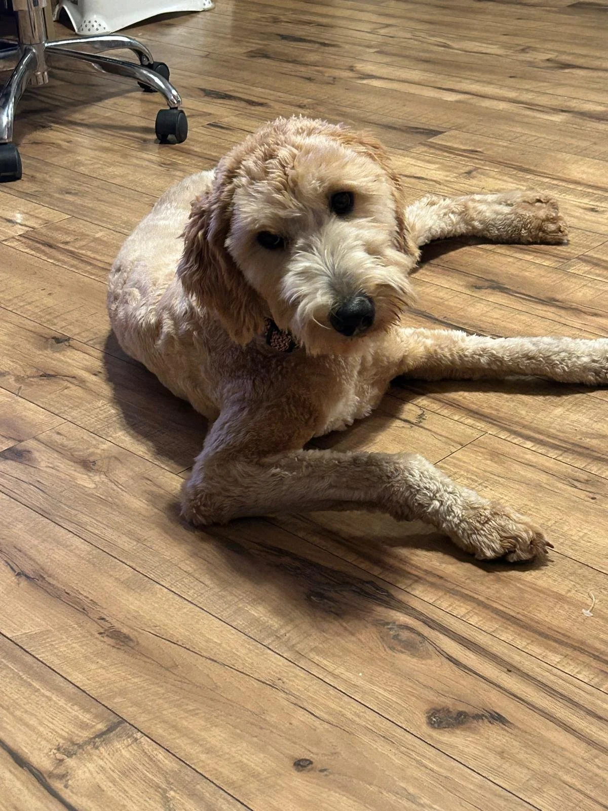 Meet Vida , our elegant standard F1 goldendoodle girl. Vida boasts a stunning blend of fluffy fur and a joyful spirit. Her size matches her big heart, as she loves to be around peopled and shower them with affection. With a playful yet calm temperament, Vida is equally at home running through the park or relaxing at your feet. Her friendly nature and gentle demeanor make her the perfect giant teddy bear for all families.
